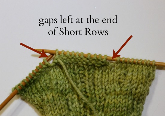 4) Now you are on the Wrong Side. So purl (sometimes you slip the first stitch but that is just cosmetic) back to the center… and then purl a bit more. It has to be an equivalent “bit” as you knitted past the center in the previous row. Then stop. You will be turning but before you do, let me point out that all this stop and turning (without wrapping) leaves gaps.