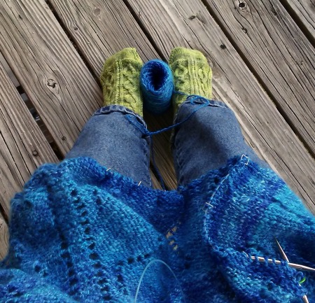 All of which is to say that I’m much better at knitting than I am at this computer stuff. And my socks have been done for days. In fact I’ve worn then, washed them, and am now wearing them again. Also, I’m making good progress on my big, blue, bridal shawl while keeping a wary eye on my computer/internet/Wordpress. If any of that stuff breaks again I may hunt down a computer geek, kidnap him/her, and make them prisoner in my home.