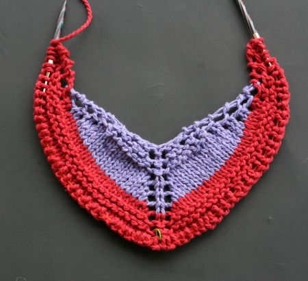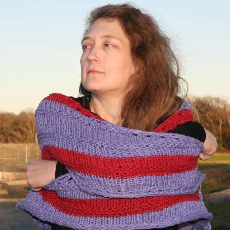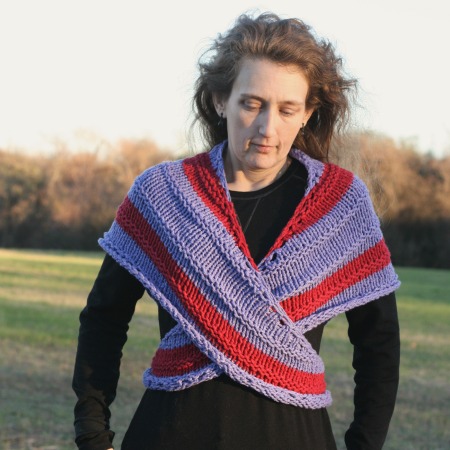 Very pretty and practical! I love that you knit it up in your signature purple and red. I’ve got some skeins of bulky yarns that would make a bright and cheery bustle shawl!