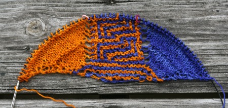 But as I was clicking along on my new Trickery I was struck with and idea to use the same techniques to make a trickery-like shawl. Something with shaping and a more challenging mosaic pattern. The idea was burning a hole into my brain so I put down the gray and green, took up some orange and blue (love the wild colors) and this happened: