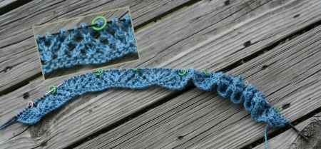 But I do like stoles. I like that giant rectangular shape. Its an easy framework to work and design within and I have had this idea for a stole that starts off as lace design, shifts into a new lace design, and then into a third, and then maybe into a combo lace-n-cable motif and… well you get the idea. So instead of getting back to my Trickery stole, I started up a new stole.
