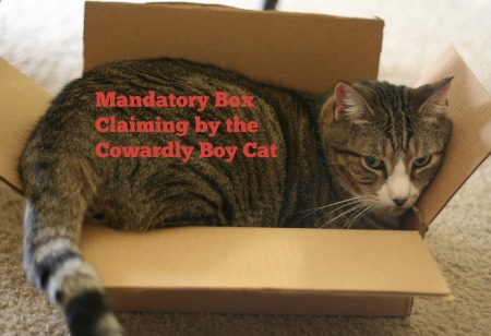 I can, however, already confidently report that the box is too small for Cowardly Boy Cat to lay down in.