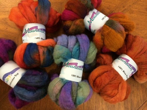 - for the Honorable Mention we have 4 oz of Targhee Top/ Bluefaced Leicester roving in Blue Bird from Mountain Colors Yarn. This is a “special order only” colorway and I’m having trouble finding a pic of it. So I’ll just show you a pile of their lovely roving an let your imagination take over!