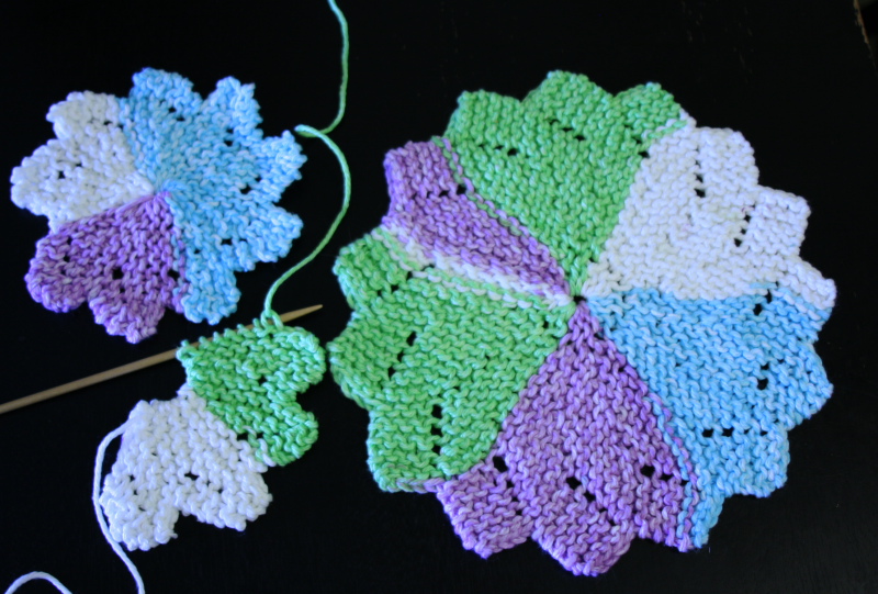 Its an Almost Lost Washcloth with two Mini Almost-Losts. The yarn is Sweet Pea Stripes from Peaches and Cream. I love this pattern, its easy and elegant and the minis go fast!